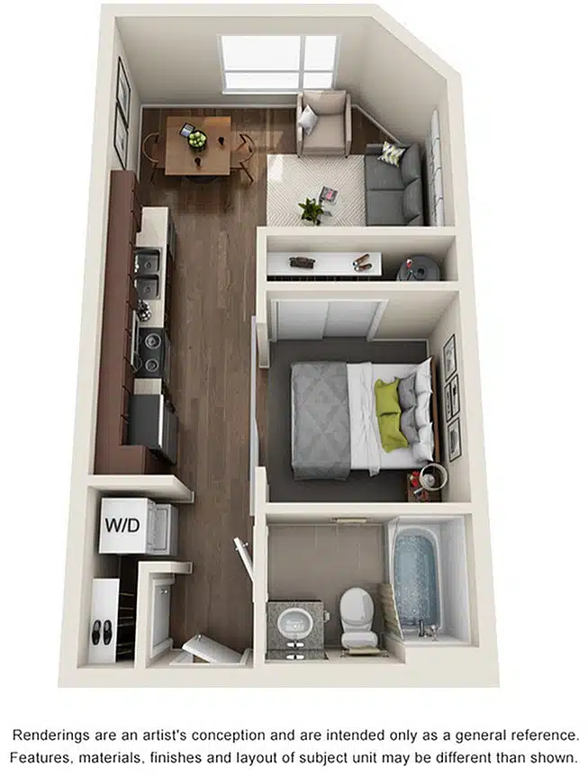 A 3D image of the 1BR/1BA – Walnut floorplan, a 400 squarefoot, 1 bed / 1 bath unit